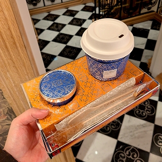 キラキラかつ華やかなアラベスク文様、小さいカップにはミルクとバターを合わせた様なクリームが入っていて、コーヒーと混ぜたら凄い濃厚でした!